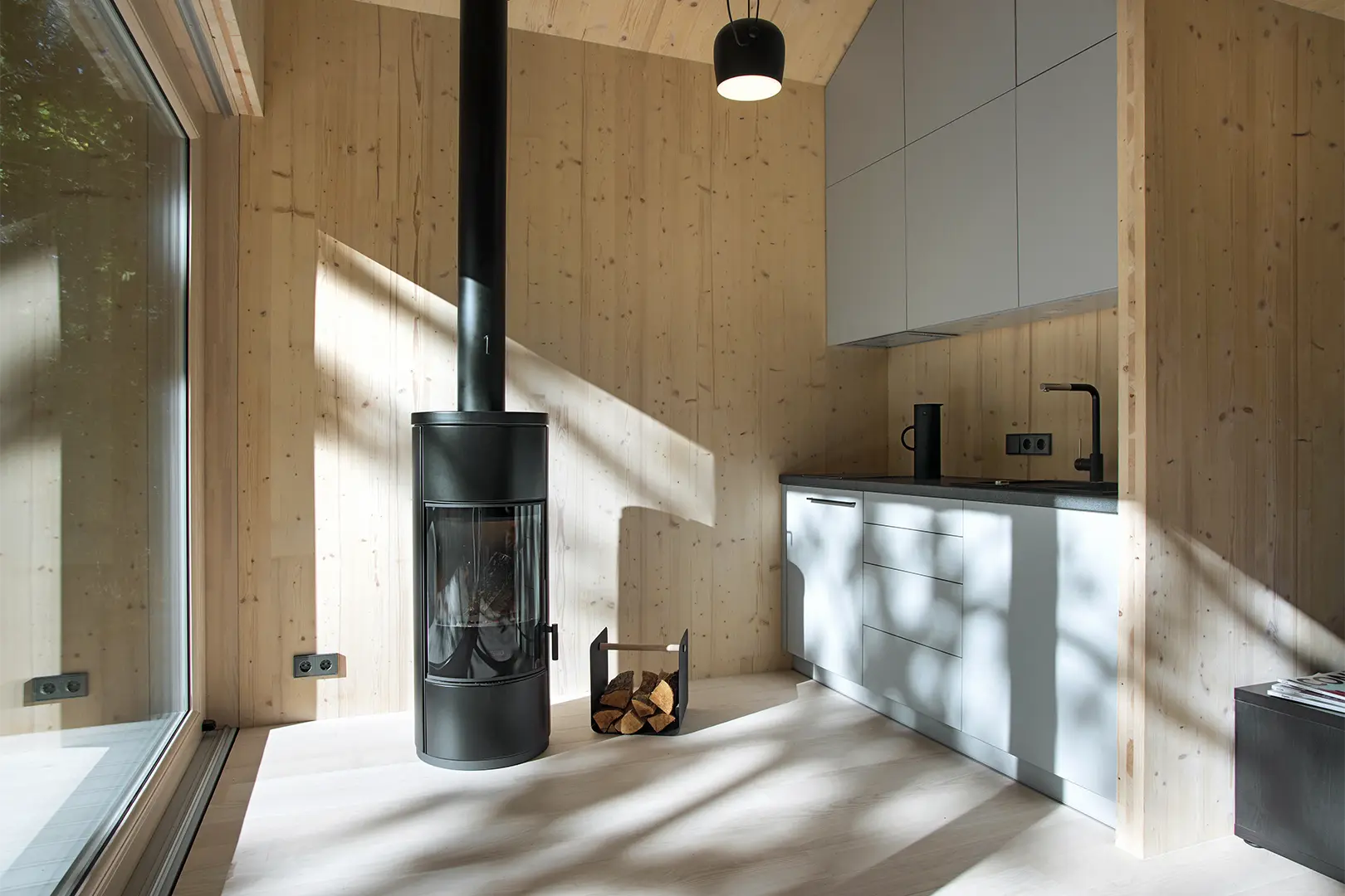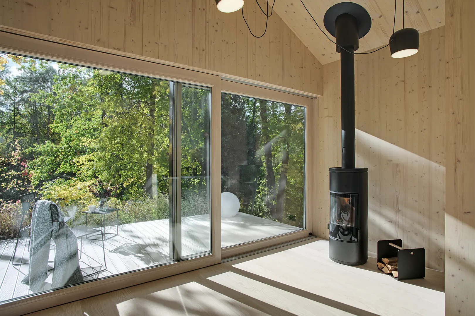 Bij deze tiny houses gaat het om het doorbreken van grenzen. Door de glazenwand smelten bos en huis samen tot één.