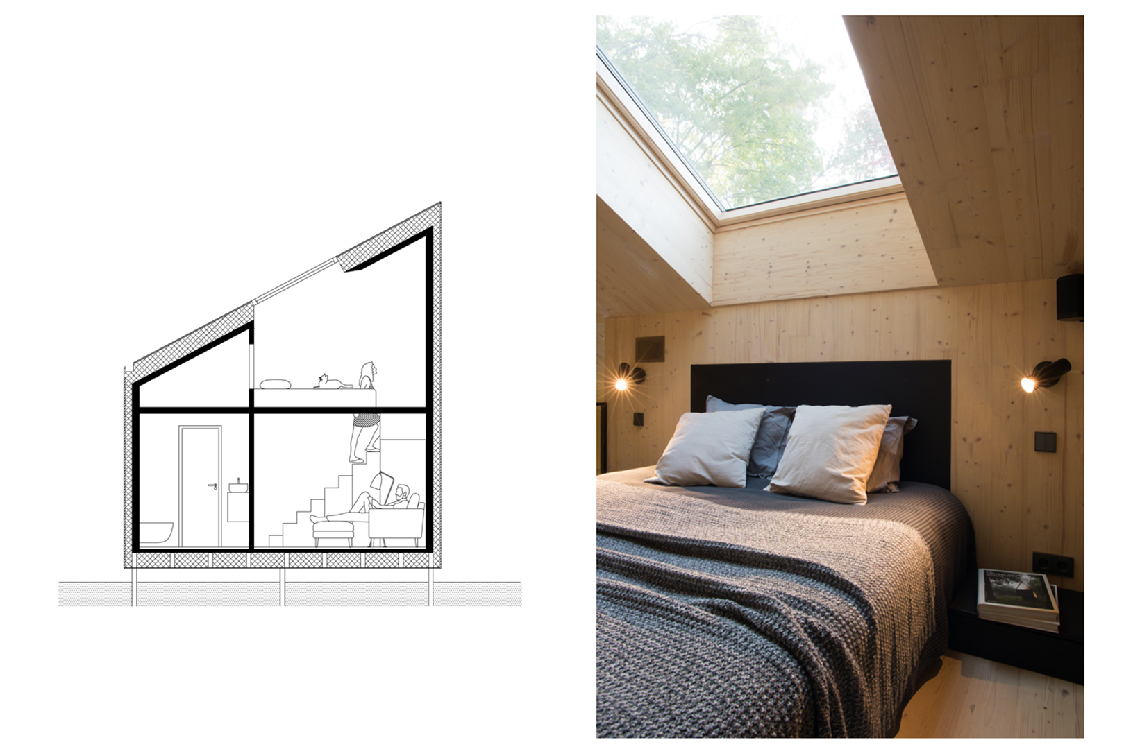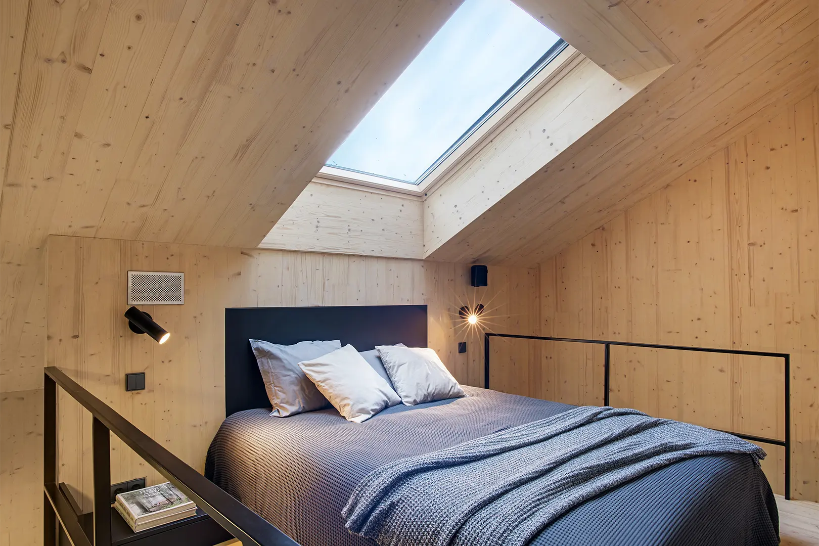 Ruimte voor een groot tweepersoonsbed is ontworpen op het tweede niveau net onder de sterrenhemel.